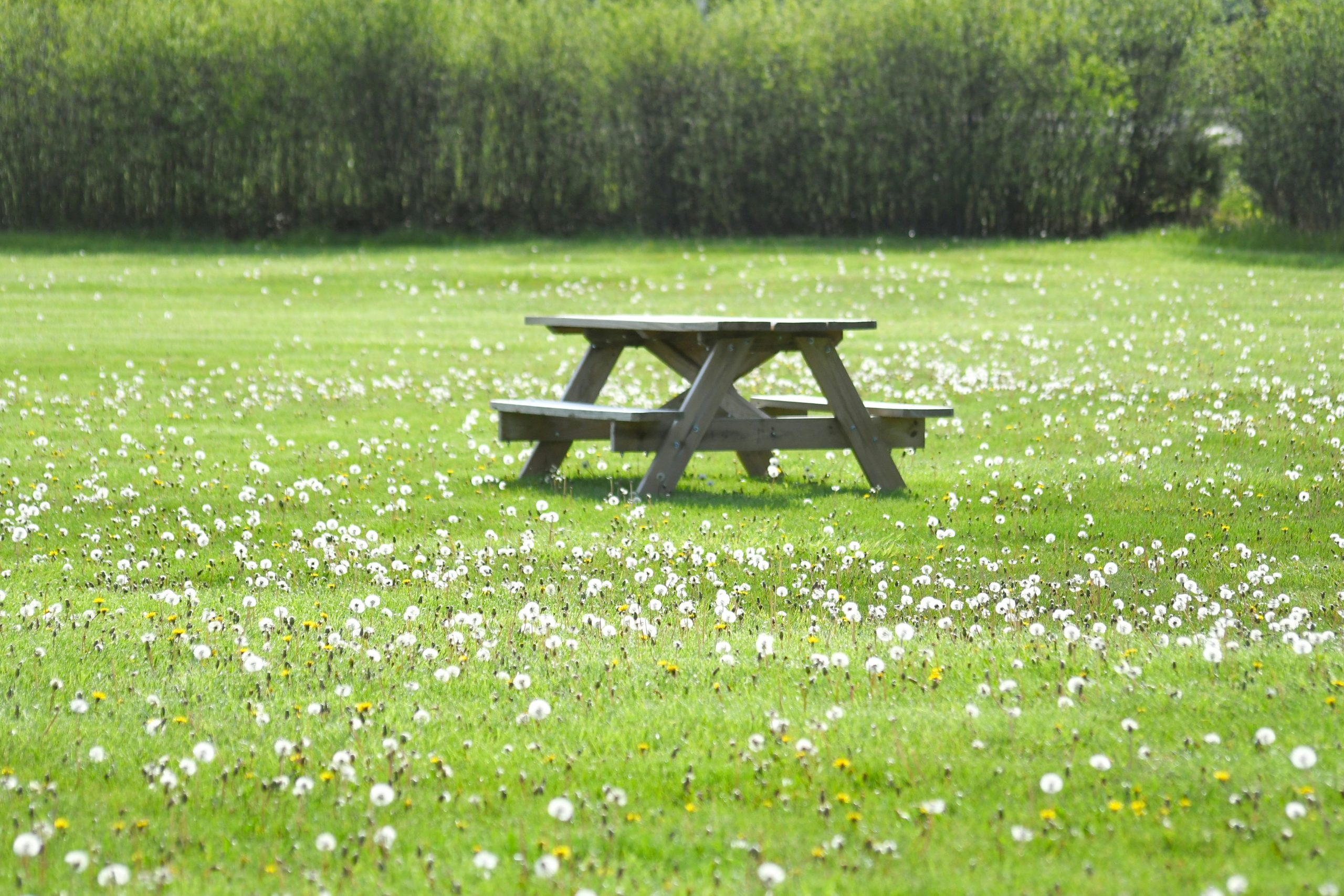 大きな芝生広場があり、開放感のある景色を楽しむことができます。木々に囲まれたエリアもあり、自然を感じながらゆったり過ごすことができます。